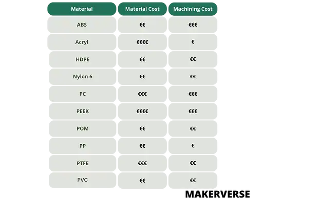 Il polimero scelto influisce sul prezzo del componente. Oltre al costo della materia prima, alcuni polimeri possono comportare spese di lavorazione aggiuntive. Questa tabella mostra le differenze.