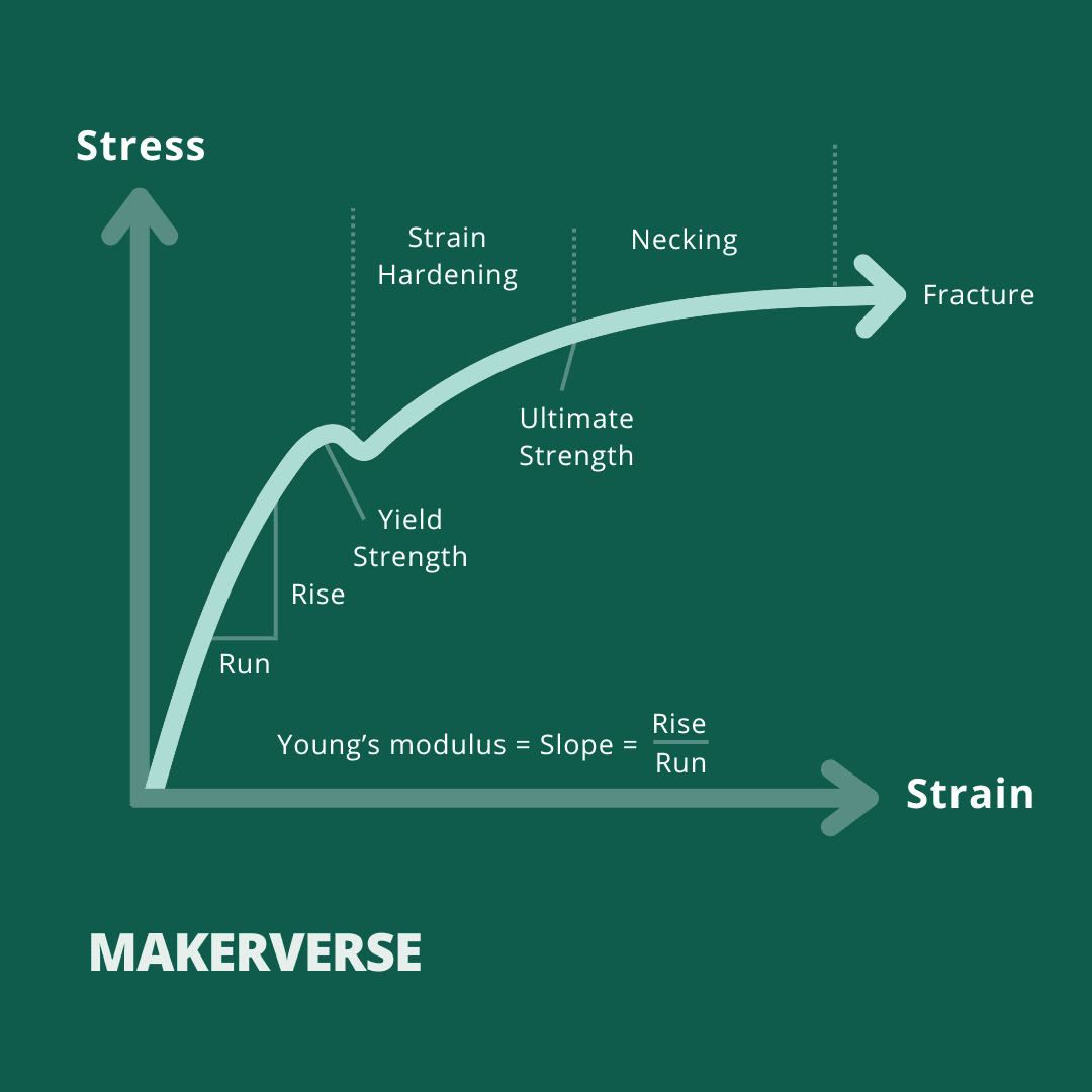 This stress-strain curve illustrates how a material reacts to stress (force per unit area) and strain (deformation). When testing, engineers are interested in how much strain the material can withstand before failing. The more strain a material can absorb, the more ductile it is.